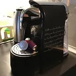This apartment provides coffee and tea making equipment and an equipped kitchen with a microwave oven, a fridge, and kitchenware.